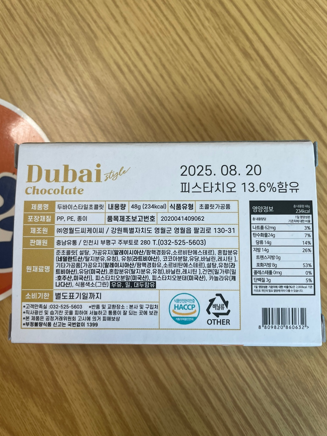 두바이초콜릿의 가장 큰 특징이 피스타치오라고 들었습니다만...피스타치오가 13.6%나 함유 되었다네요?