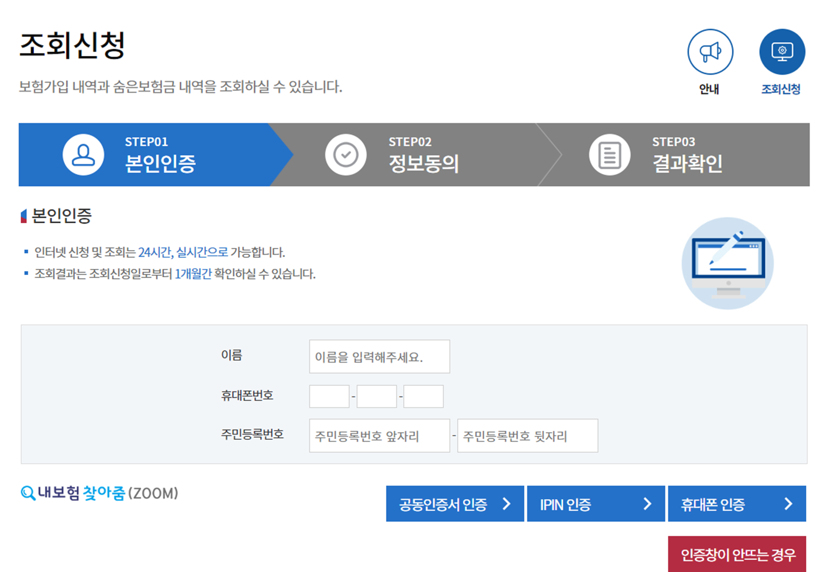 3. 조회신청 화면에서 본인인증 정보 입력 후 본인 인증