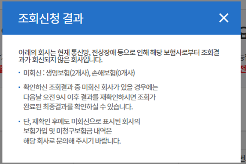 조회 결과 화면에서 하기와 같은 팝업창이 뜹니다. 보험사마다 통신망 등의 차이로 조회가 바로 되지 않는 회사들이 있는것 같아요. 저도 특정 보험회사의 상품이 바로 조회되지 않더라고요. 다만 이런 경우에도 다음날 오전 9시 이후에 결과 재확인 시 확인이 가능하다고 하네요.^^
