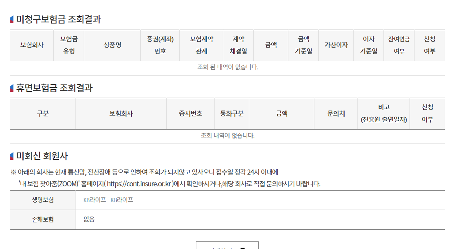 조회 결과의 하단에는 아래 이미지와 같이 제 이름으로 미청구된 보험금과 휴면 보험금 등 결과가 뜹니다. 역시나 저는 전혀 없네요.ㅎㅎ