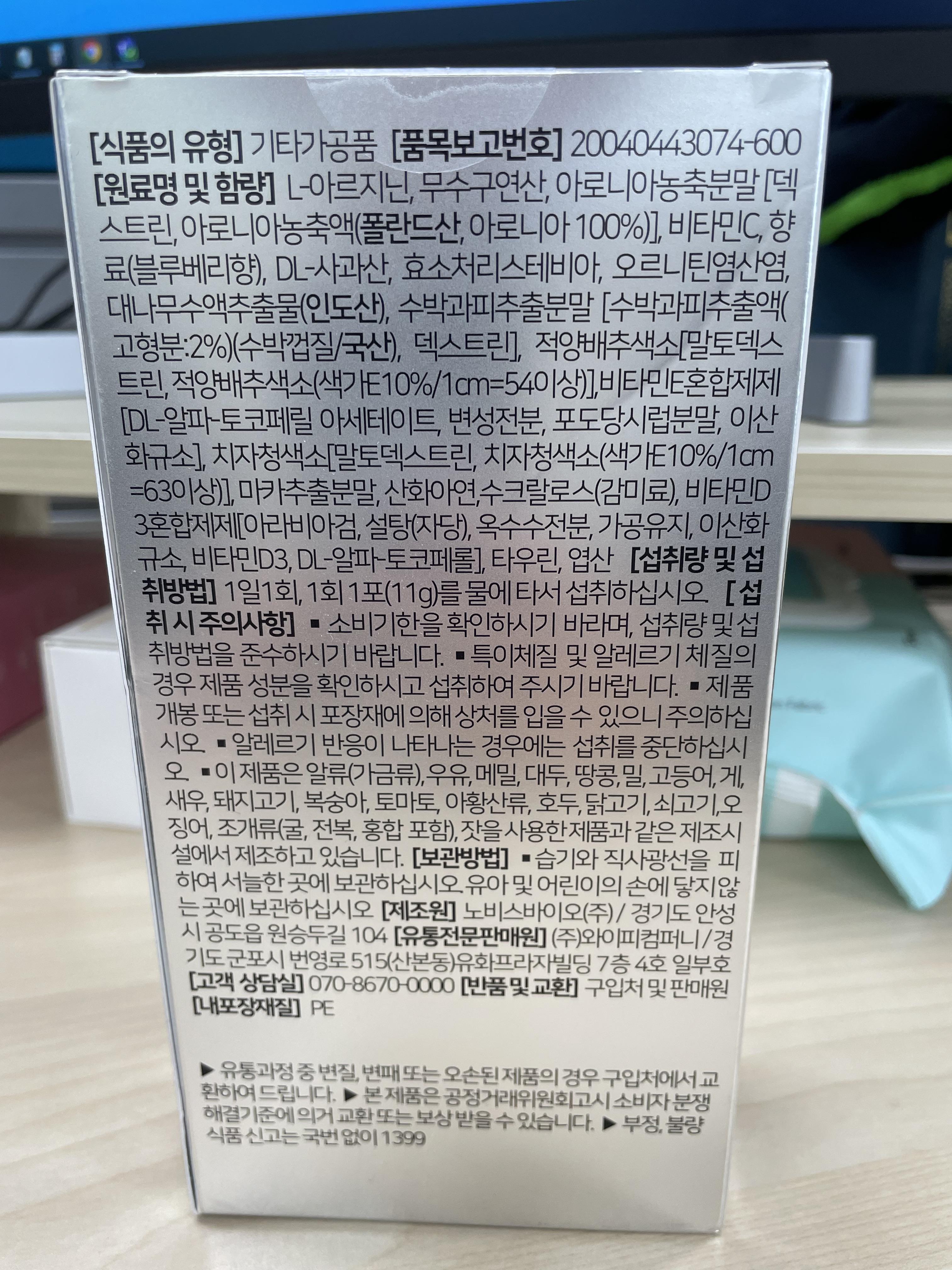- 먹는 시간 : 아르기닌은 공복에 흡수율이 좋다고 해서 아침 공복에 마심