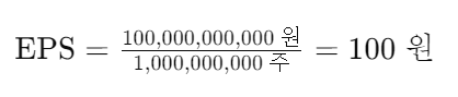 어떤 회사가 한 해 동안 100억 원의 순이익을 올렸고, 발행 주식 수가 10억 주라고 가정해봅시다. 이 회사의 EPS는 다음과 같이 계산됩니다.